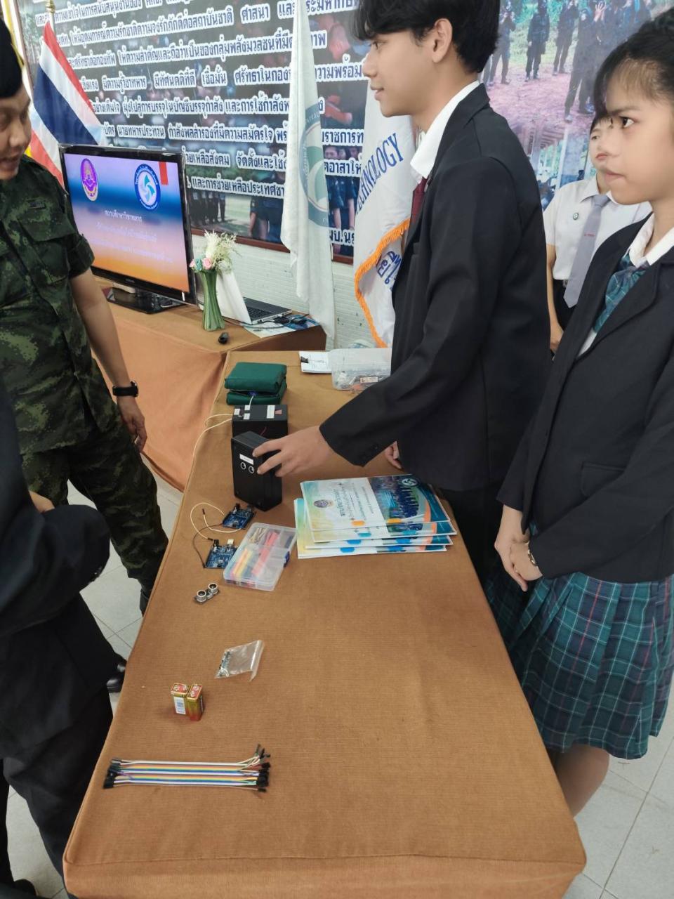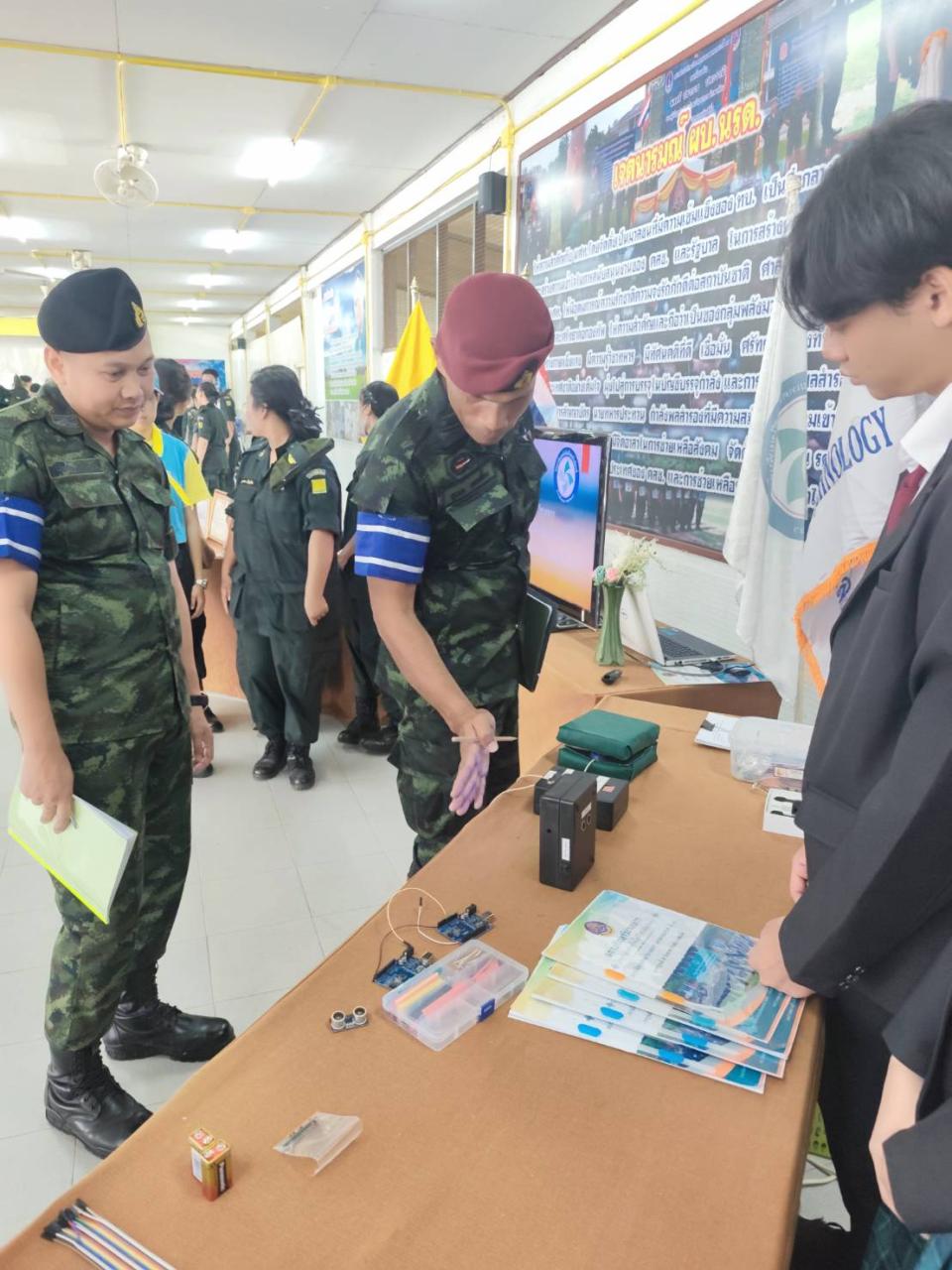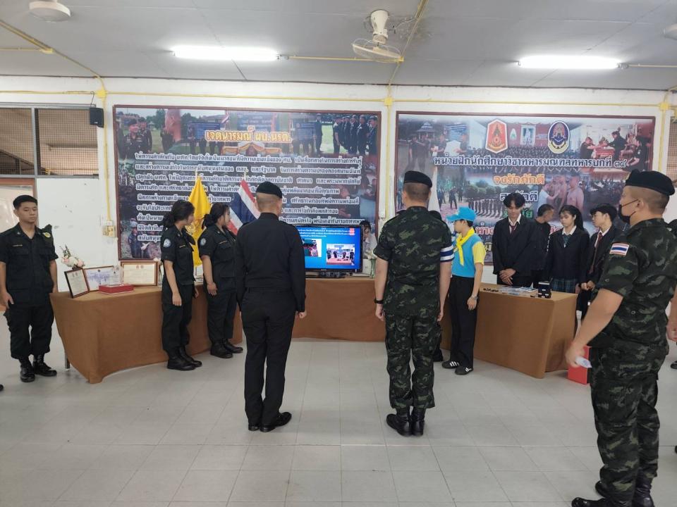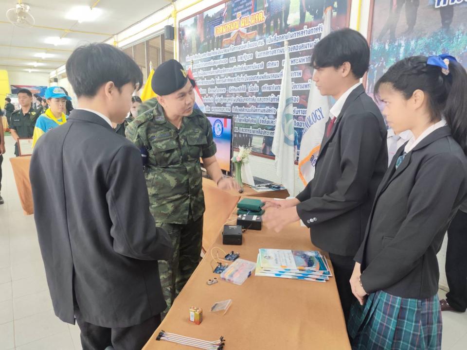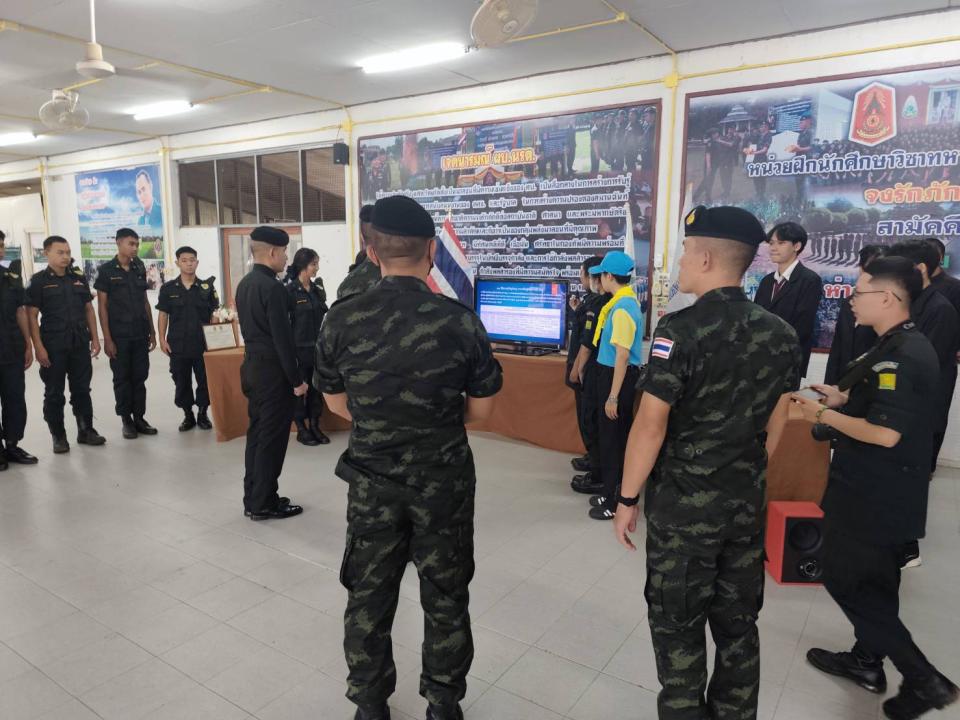 จัดบูธนิทรรศการเพื่อนำเสนอผลงานนวัตกรรมเครื่องช่วยฝึกนักศึกษาวิชาทหารและบรรยายสรุปรับตรวจศูนย์ฝึกแข่งขันสถานศึกษารวมใจ