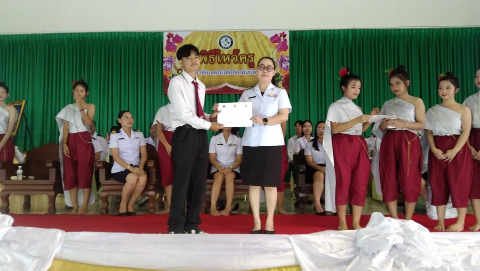 ผศ.ดร.ผกาภรณ์ บุสบง ผู้อำนวยการวิทยาลัยเทคโนโลยีไชยพันธ์พงษ์ มอบเกียรติบัตรให้แก่นักศึกษาที่ได้รับรางวัลในการแข่งขันทักษะวิชาชีพประจำกลุ่มภาคเหนือ ประจำปีการศึกษา ๒๕๖๘ ที่ผ่านมา